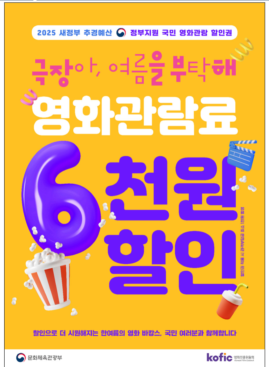 - 영화진흥위원회와 문화체육관광부가 공동으로 진행하는 영화 할인 지원 정책으로, 전 국민을 대상으로 관람료 1매당 6,000원 할인 쿠폰을 제공합니다