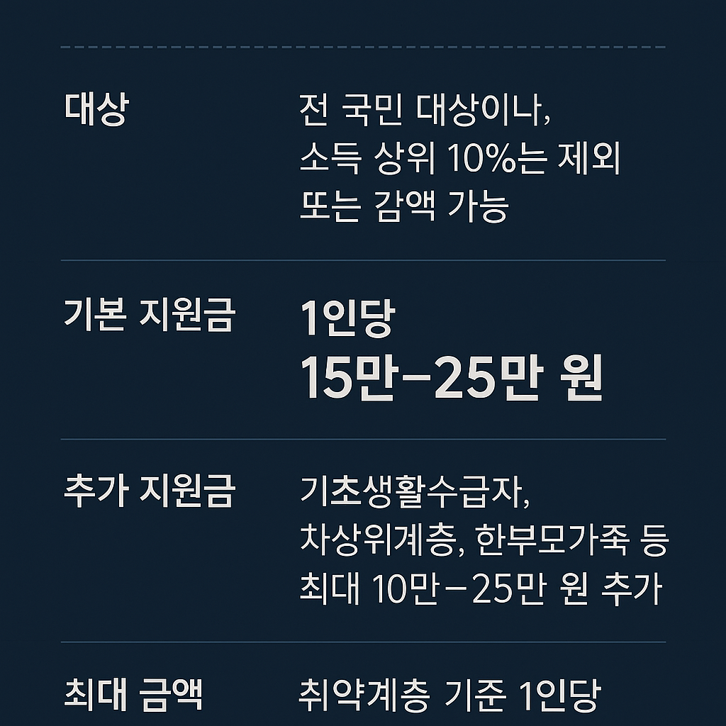 기획재정부에 따르면 기본 지급액은 15만 원에서 25만 원 사이로, 전 국민을 대상으로 하지만 고소득층은 일부 감액 또는 제외될 가능성이 있습니다. 여기에 더해, 기초생활수급자나 차상위계층, 한부모가정과 같은 취약계층에는 최대 25만 원까지 추가 지급이 논의되고 있습니다.