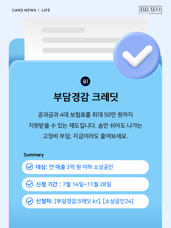 정부는 전기요금, 가스요금, 4대 보험료 등으로 부담이 커진 소상공인을 위해 최대 50만 원까지 지원하는 ‘부담경감 크레딧’을 도입했습니다.